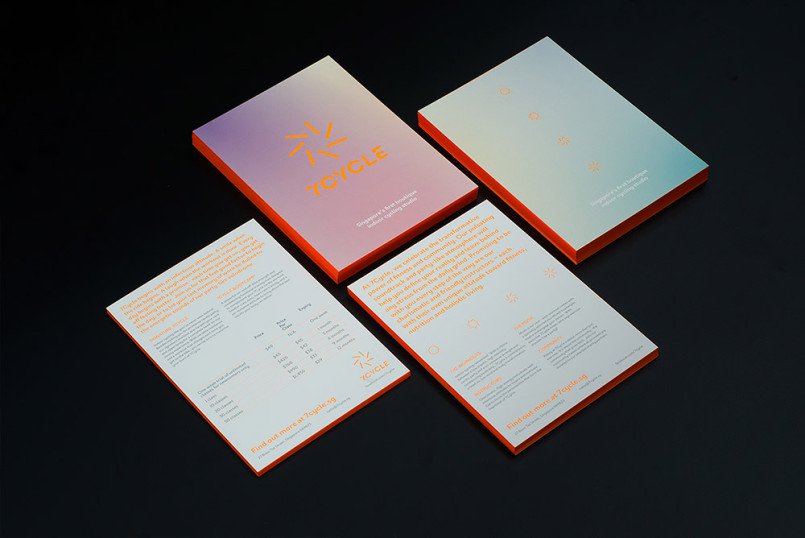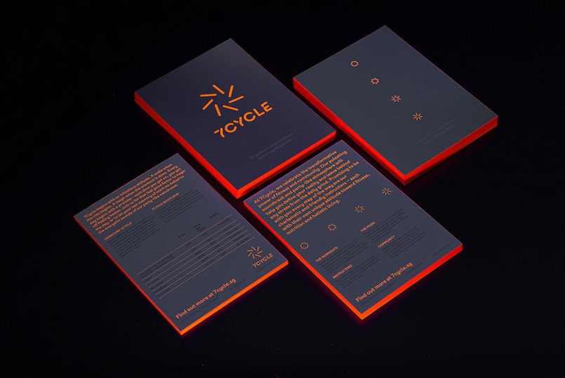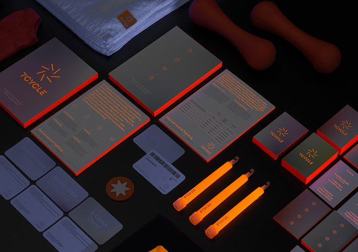 这个动画的标志有七个旋转辐条,在保持个人7天的锻炼和营养健康制度的重要性的同时,也为群体周期元素提供了补充。”在品牌拼贴中,霓虹灯橙色的口音与柔和的渐变调色板一起使用,以更轻的触感突出品牌的强度元素。在紫外线下,霓虹灯在黑暗中发光,这说明了7周期充满活力的聚会体验。
