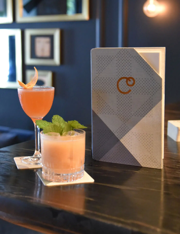 为酒吧和餐厅设计定制的菜单集是由温暖和现代的颜色来区分的。有角的彩色平面被覆盖,以创造引人注目的几何形状,并反映在菜单盖的修剪角。