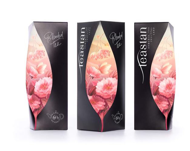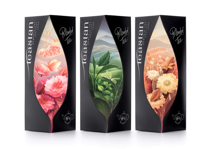 创造这种茶叶品牌标志设计包装设计的挑战是在视觉上表达茶的联想和感受、香气以及饮用时传递的效果。